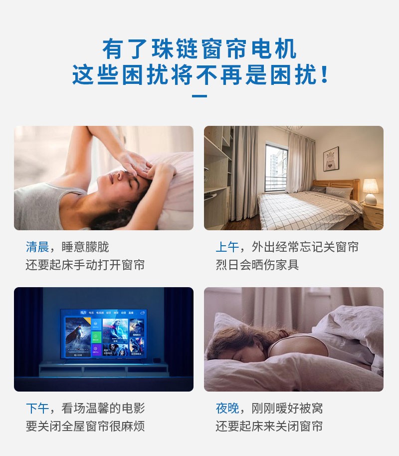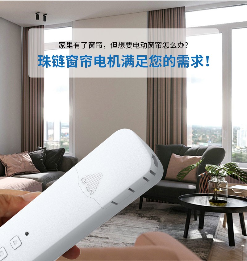 此產品適用于拉珠卷簾,可以把傳統的拉珠卷簾改變為智能電動窗簾,安裝簡單,操作方便。安裝后可通過遙控器、語音、手機APP等控制窗簾升降。